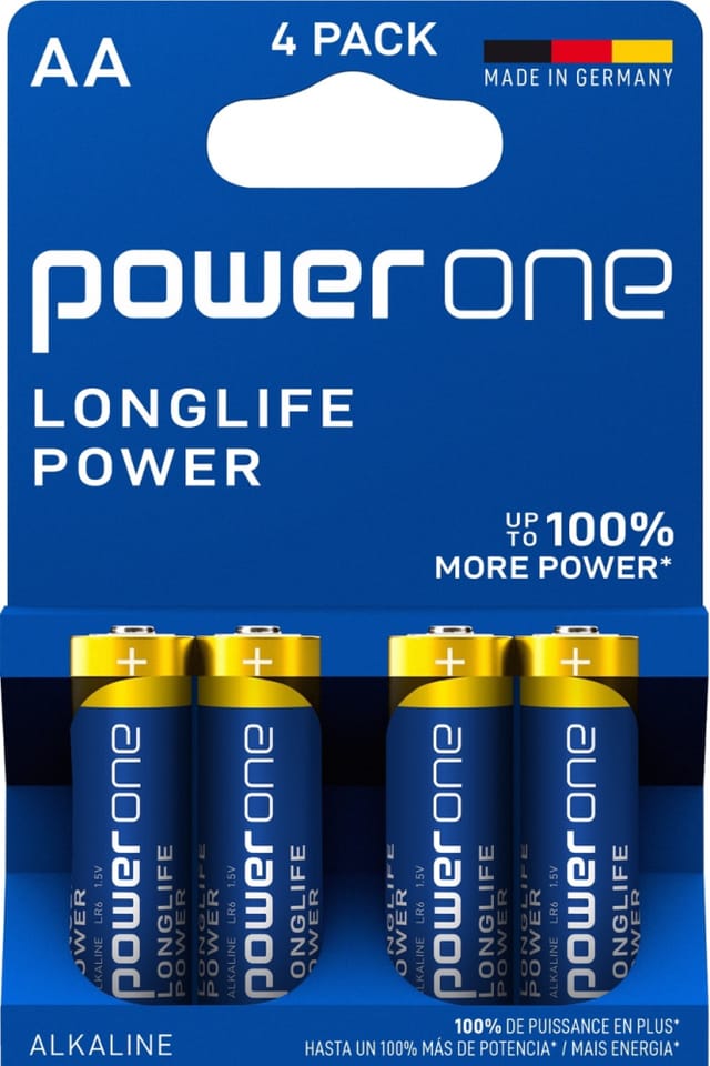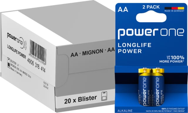 Pilas Alcalinas AA - Blister - 2 Pilas - Marca: power one - Fabricado en Alemania, hecho para durar - 1.5 Voltios - Pilas desarrolladas para dispositivos de alto consumo de energía - Expertos en Baterías desde 1887 - Almacenamiento garantizado de 10 años - 100% más potencia* (en iluminación portátil en comparación con la duración media mínima de ANSI 18.1M, Parte 1-2021. El rendimiento puede variar según el uso) - Empaque 100% Reciclable, inteligente y cómodo: mecanismo innovador de apertura/cierre para un almacenamiento sencillo de pilas usadas o no utilizadas - Referencia IEC: LR6