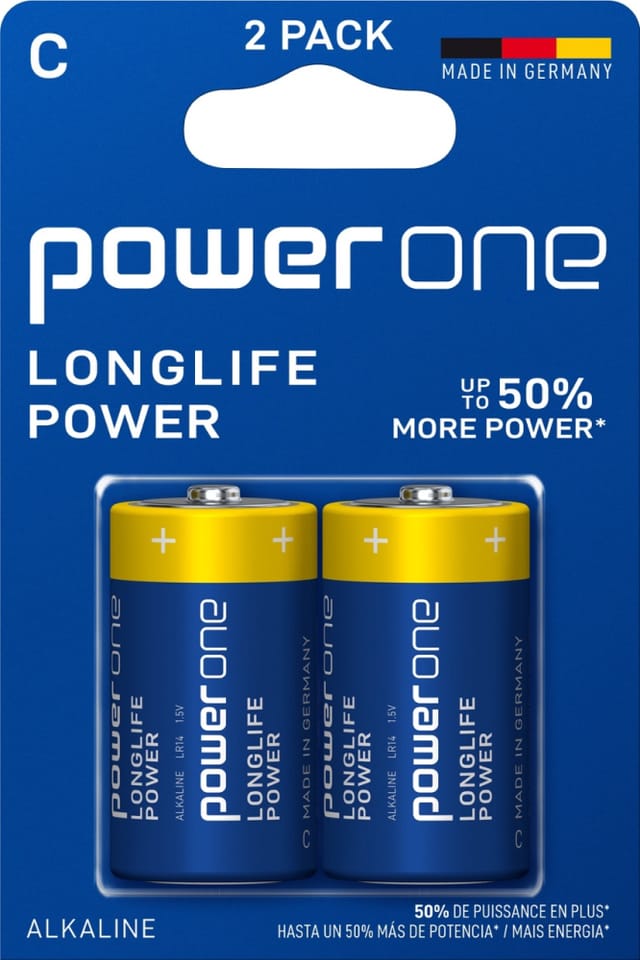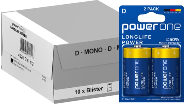 Pilas Alcalinas D - Blister - 2 Pilas - Marca: power one - Fabricado en Alemania, hecho para durar - 1.5 Voltios - Pilas desarrolladas para dispositivos de alto consumo de energía - Expertos en Baterías desde 1887 - Almacenamiento garantizado de 10 años - 50% más potencia* (en juguetes en comparación con la duración media mínima de ANSI 18.1M, Parte 1-2021. El rendimiento puede variar según el uso) - Referencia IEC: LR20
