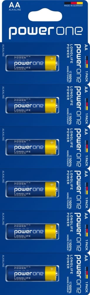 Pilas Alcalinas AAA - TIRA - 6 Pilas individuales - Marca: Powerone - Fabricado en Alemania, hecho para durar - 1.5 Voltios - Pilas desarrolladas para dispositivos de alto consumo de energía - Expertos en Baterías desde 1887 - Almacenamiento garantizado de 10 años - 100% más potencia* (en iluminación portátil en comparación con la duración media mínima de ANSI 18.1M, Parte 1-2021. El rendimiento puede variar según el uso) - Empaque 100% Reciclable, inteligente y cómodo: mecanismo innovador de apertura/cierre para un almacenamiento sencillo de pilas usadas o no utilizadas - Práctico Empaque Pila Unitario en Tira con corta fácil - Referencia IEC: LR03